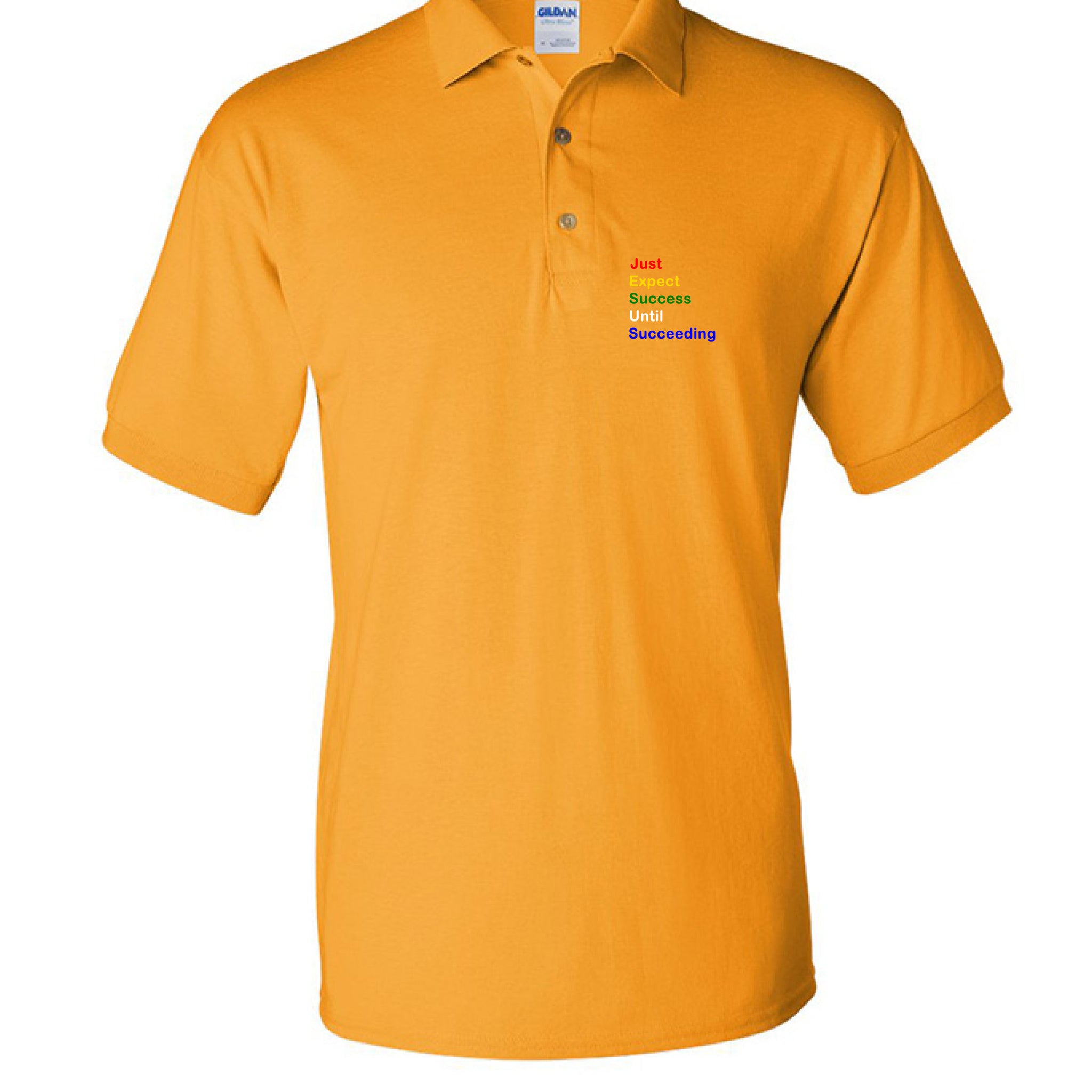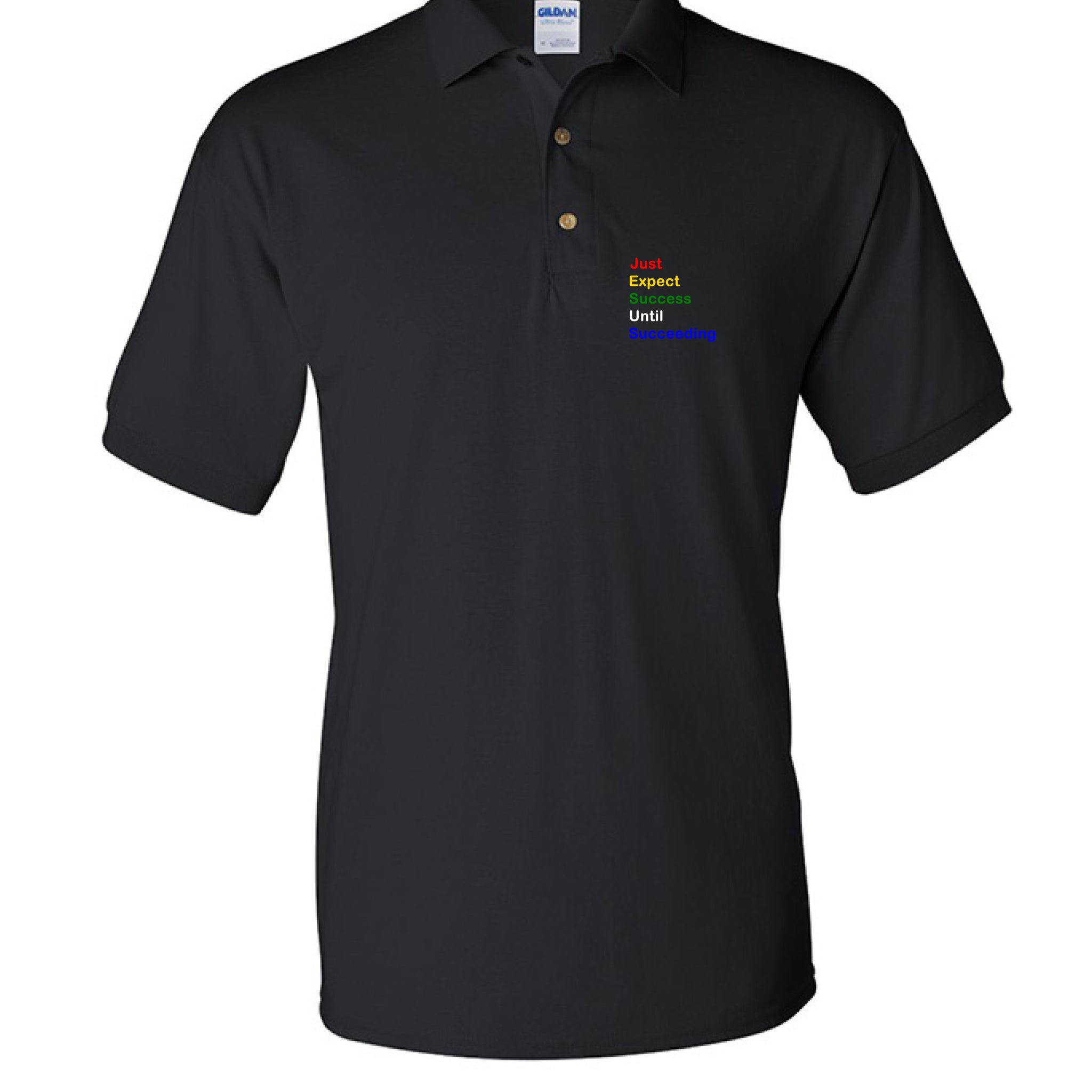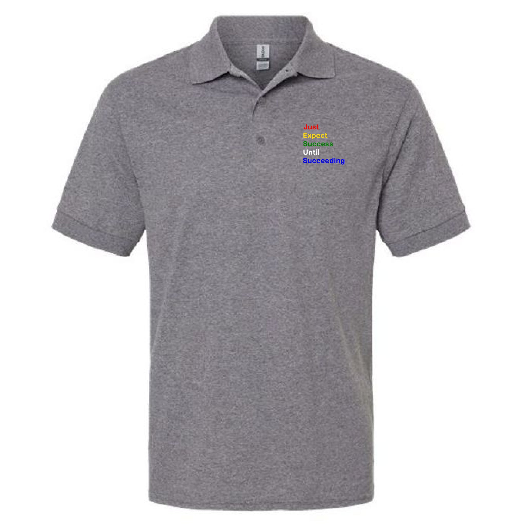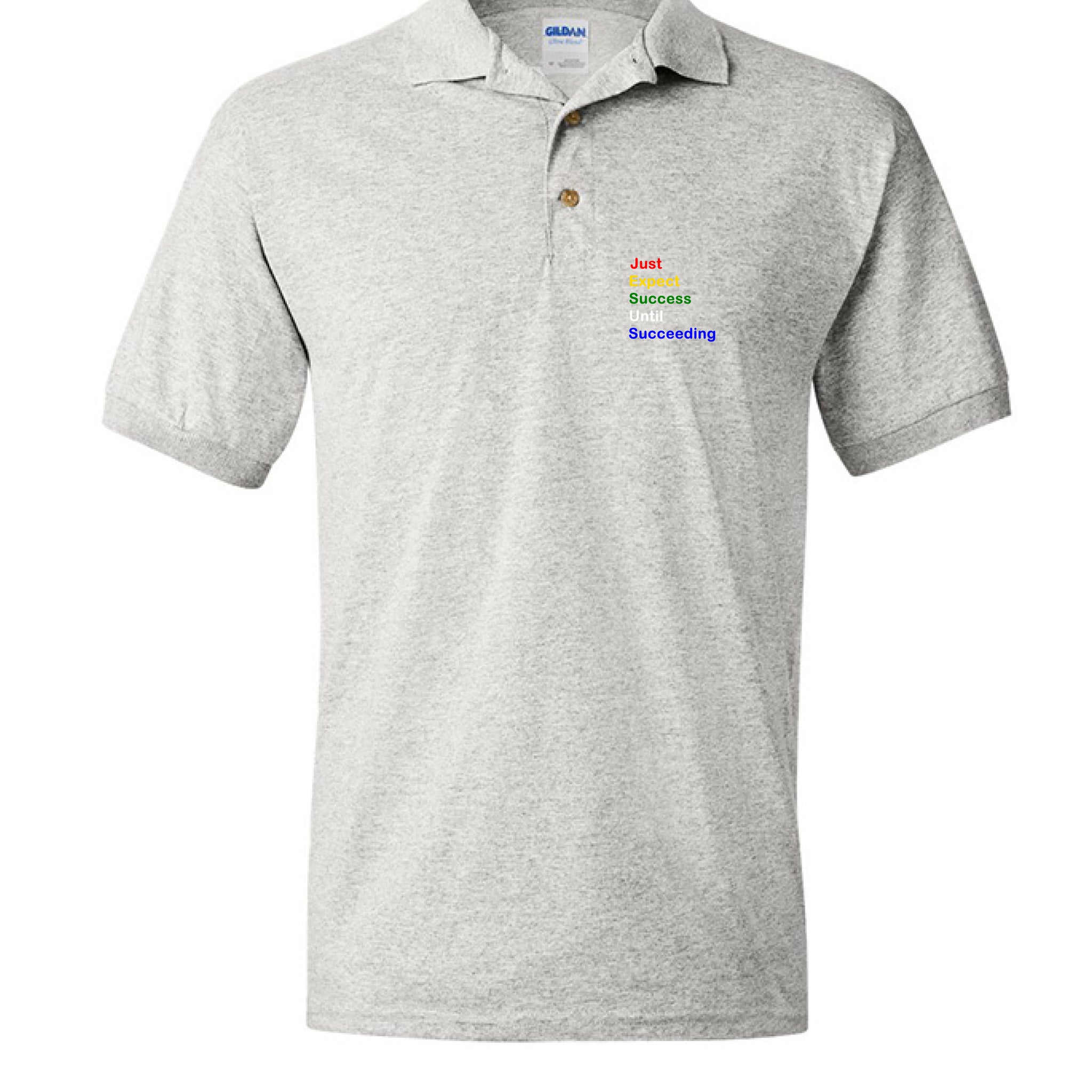 🔥 Featuring the powerful phrase “Just Expect Success Until Succeeding” in bold acrostic style, this polo makes a statement without saying a word.